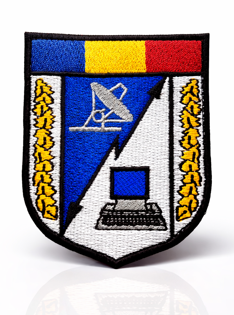Ecuson militar brodat, reprezentativ pentru structurile de informatică și comunicații, realizat cu atenție la detalii și finisaje de calitate superioară. Designul heraldic îmbină elemente moderne precum computerul și antena de comunicații, simbolizând tehnologia, conectivitatea și rolul esențial al transmisiunilor în structurile militare.